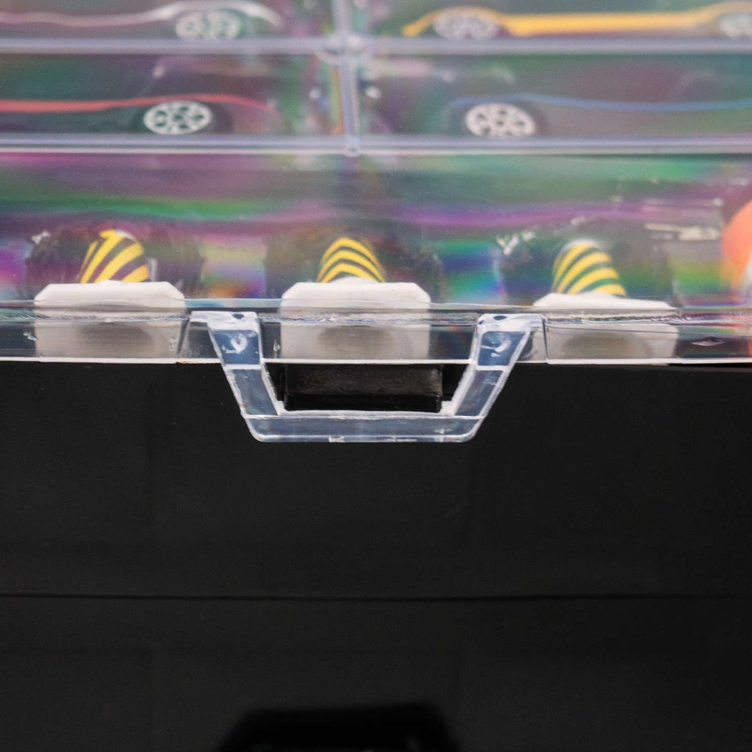 Walizka z wygodnym uchwytem pozwala dziecku zabierać swój zestaw gdzie tylko chce. Zamykane ścianki chronią przed możliwością zagubienia resoraków.