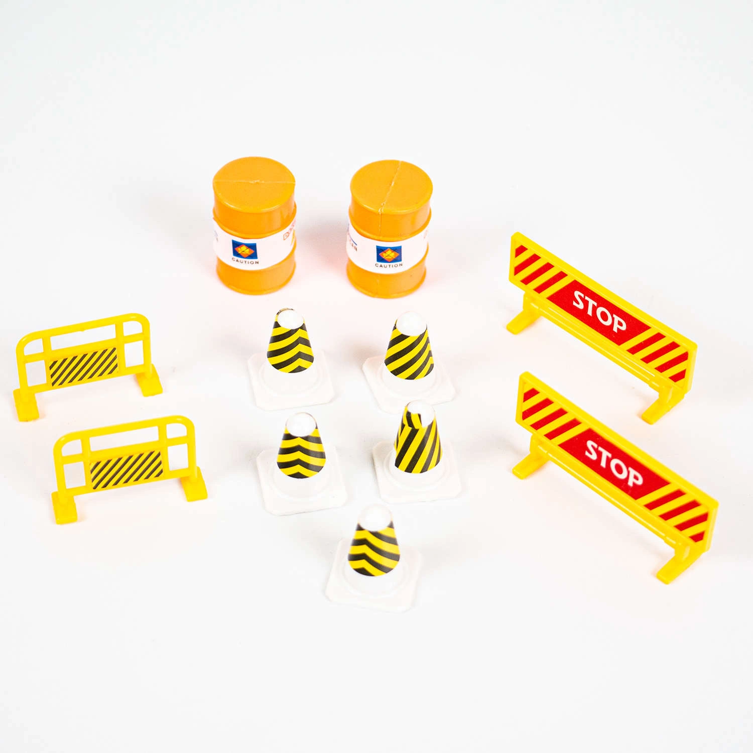 Zestaw zawiera również dodatkowe akcesoria takie jak znaki drogowe, beczki czy szlabany, które pozwolą Twemu dziecku urozmaicić tor do wyścigów o wszelakie detale czy przeszkody.