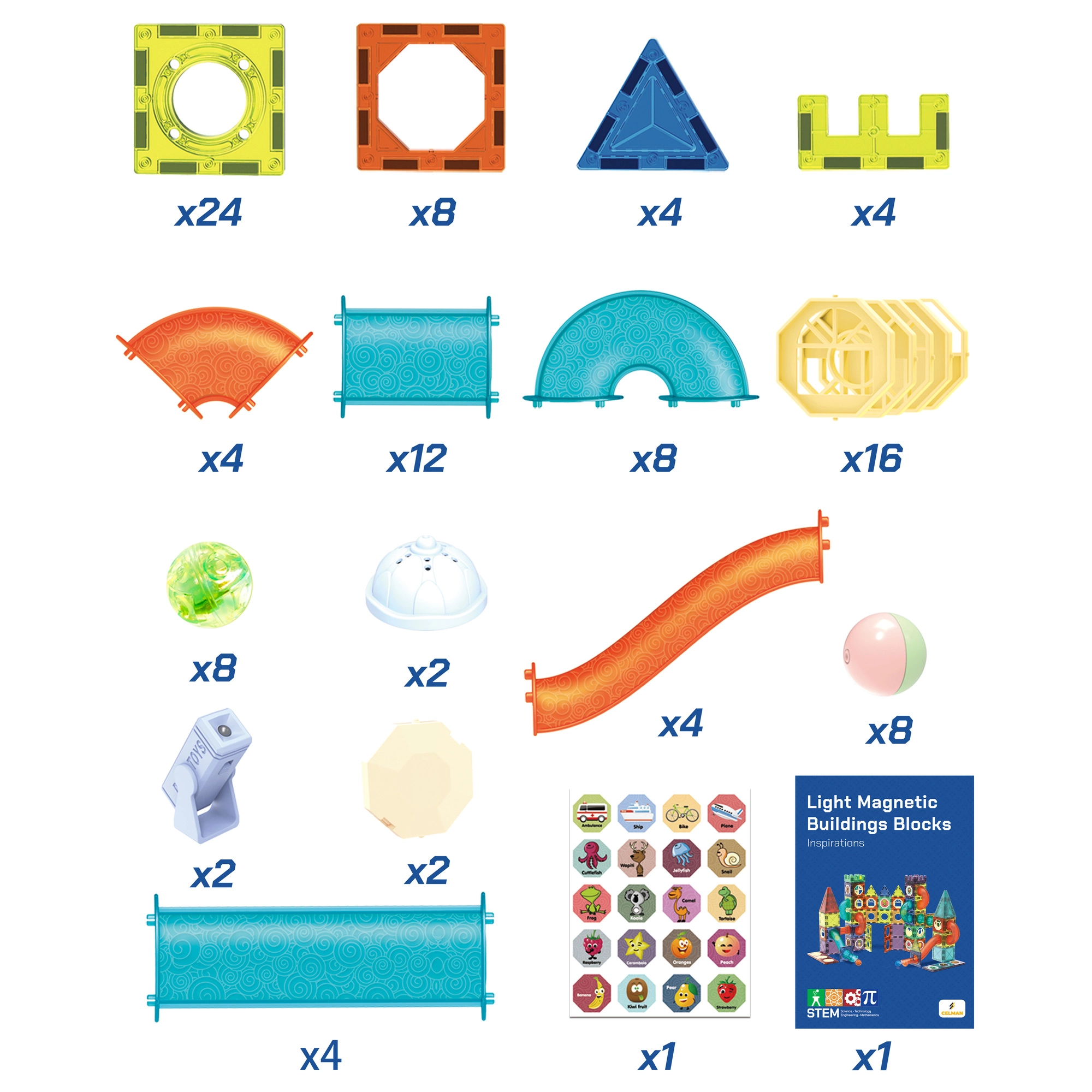 W skład zestawu klocków magnetycznych wchodzą różnorodne elementy takie jak: klocki z wzorami, okna ażurowe, naklejki z różnymi motywami, tunele oraz figurki.
