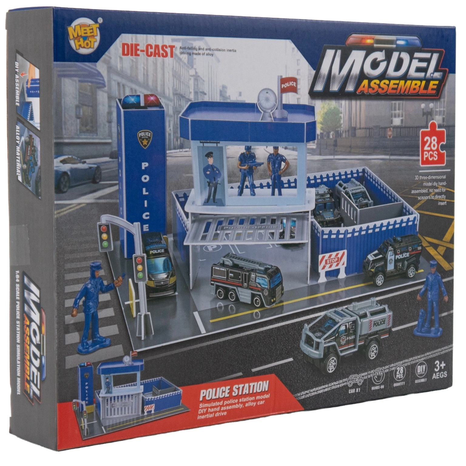 • Ten zestaw to pełna akcji zabawa konstrukcyjna - dziecko samodzielnie montuje posterunek policji, strefę parkingową, figurki i akcesoria.