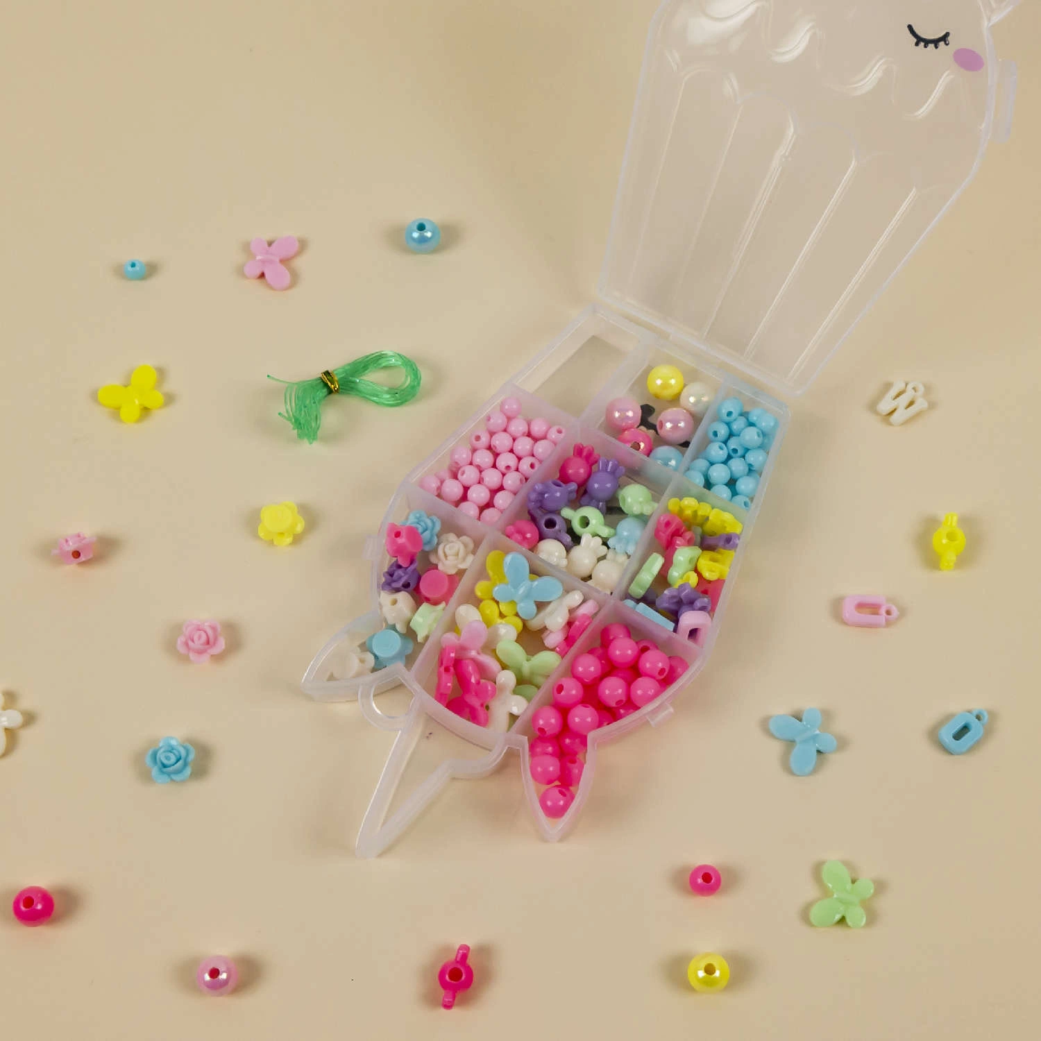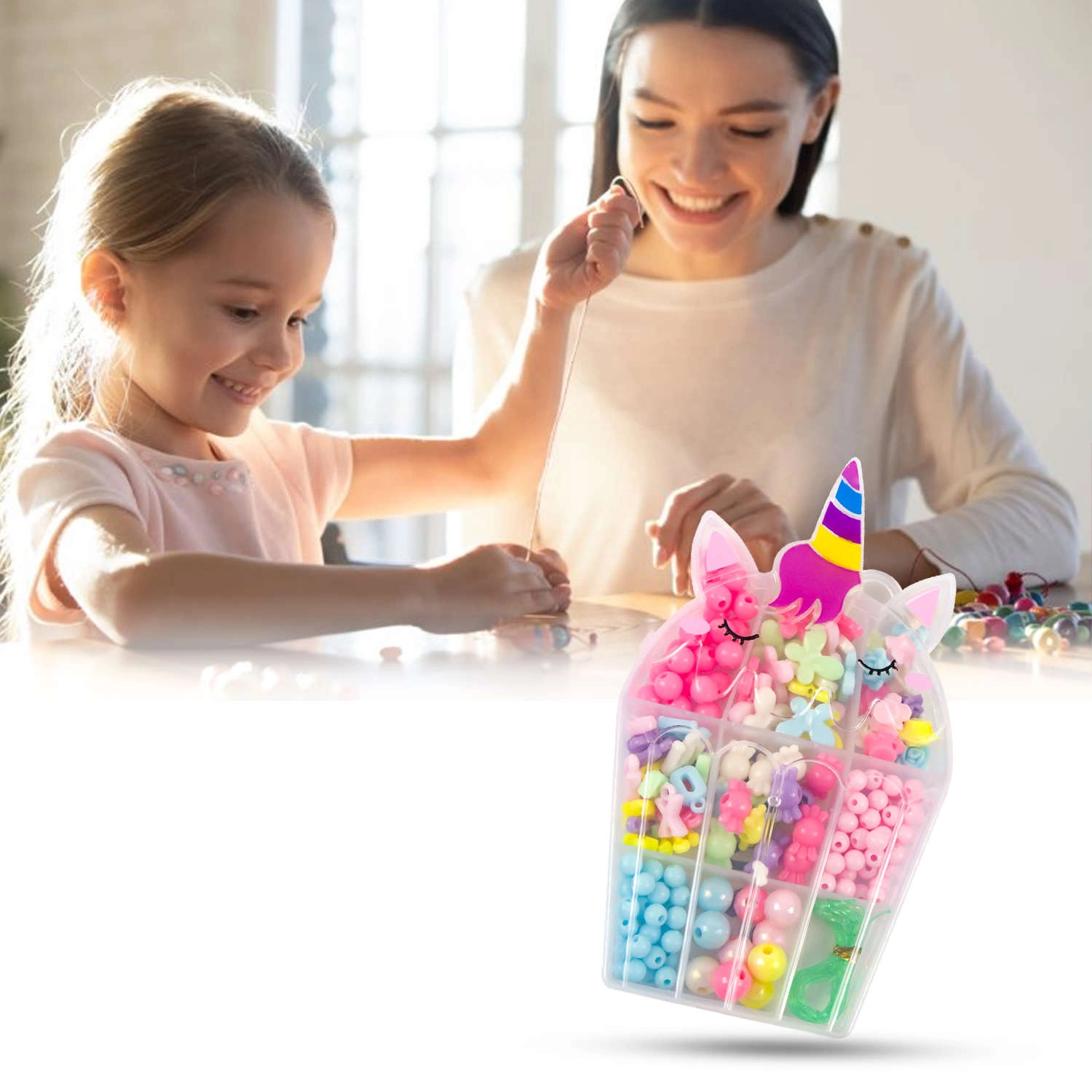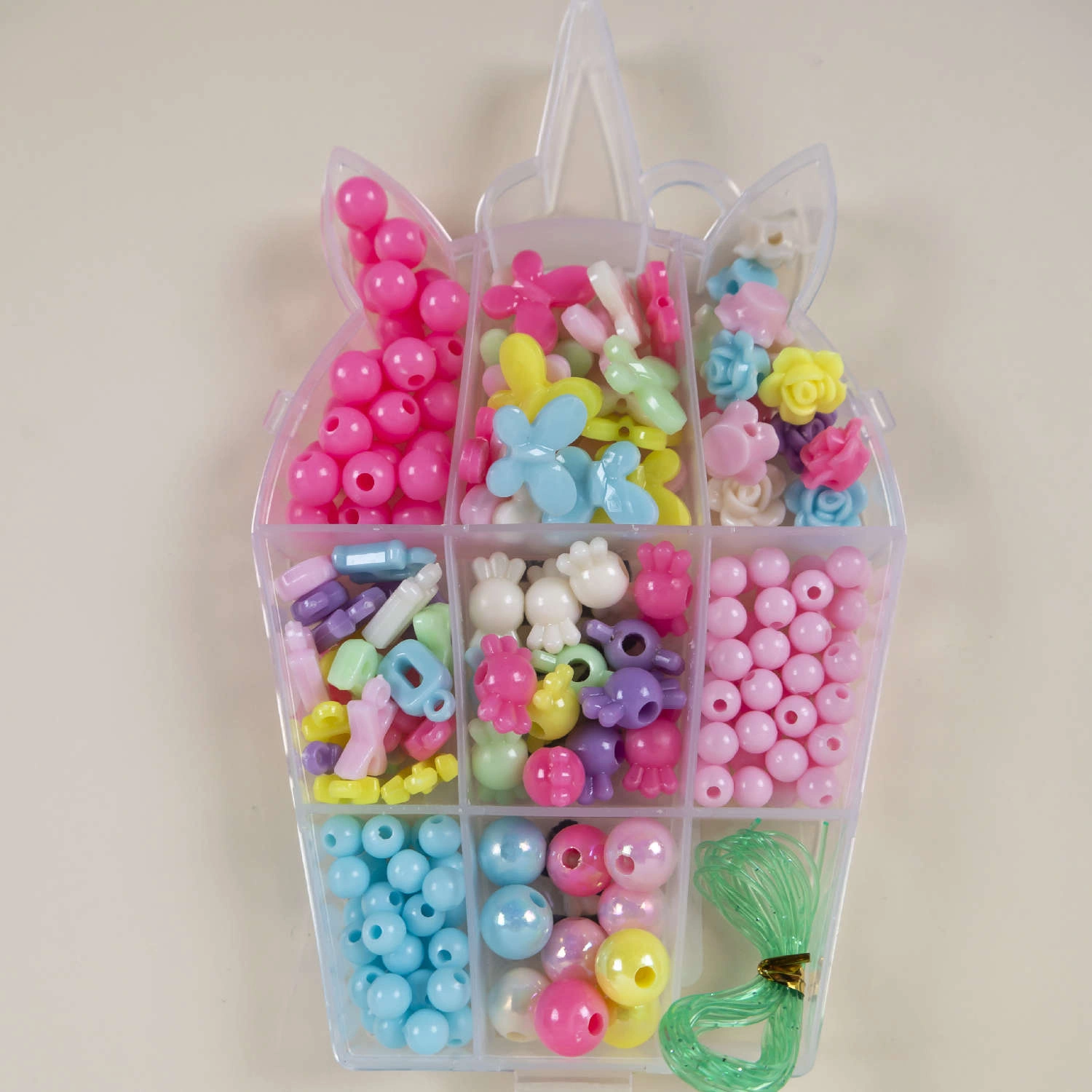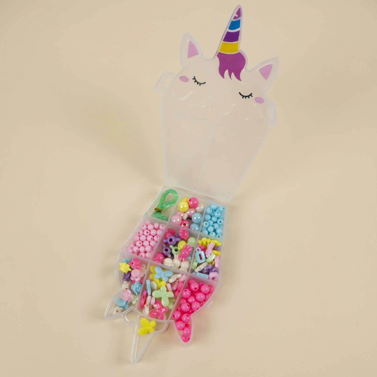 - Kompletny zestaw koralików do biżuterii, bransoletek dla dzieci. W posortowanym, zamykanym na klips pudełku w kształcie jednorożca znajdują się przeróżne wielkości oraz kształty koralików razem z żyłką.