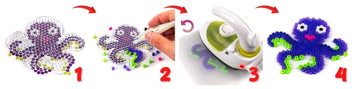 Na przygotowanej plastikowej formie z wypustkami układa się z koralików wybrany wzór. Dziecko może się tym zająć samo lub z przyjaciółmi. Gdy obrazek jest już skończony, przykrywamy go papierem do pieczenia i zaprasowujemy żelazkiem. Na tym etapie przyda się pomoc osoby dorosłej, chociaż starsze dzieci poradzą sobie same mając np. małe żelazko turystyczne. Pod wpływem temperatury koraliki stopią się i po odklejeniu papieru otrzymamy gotowy obrazek.