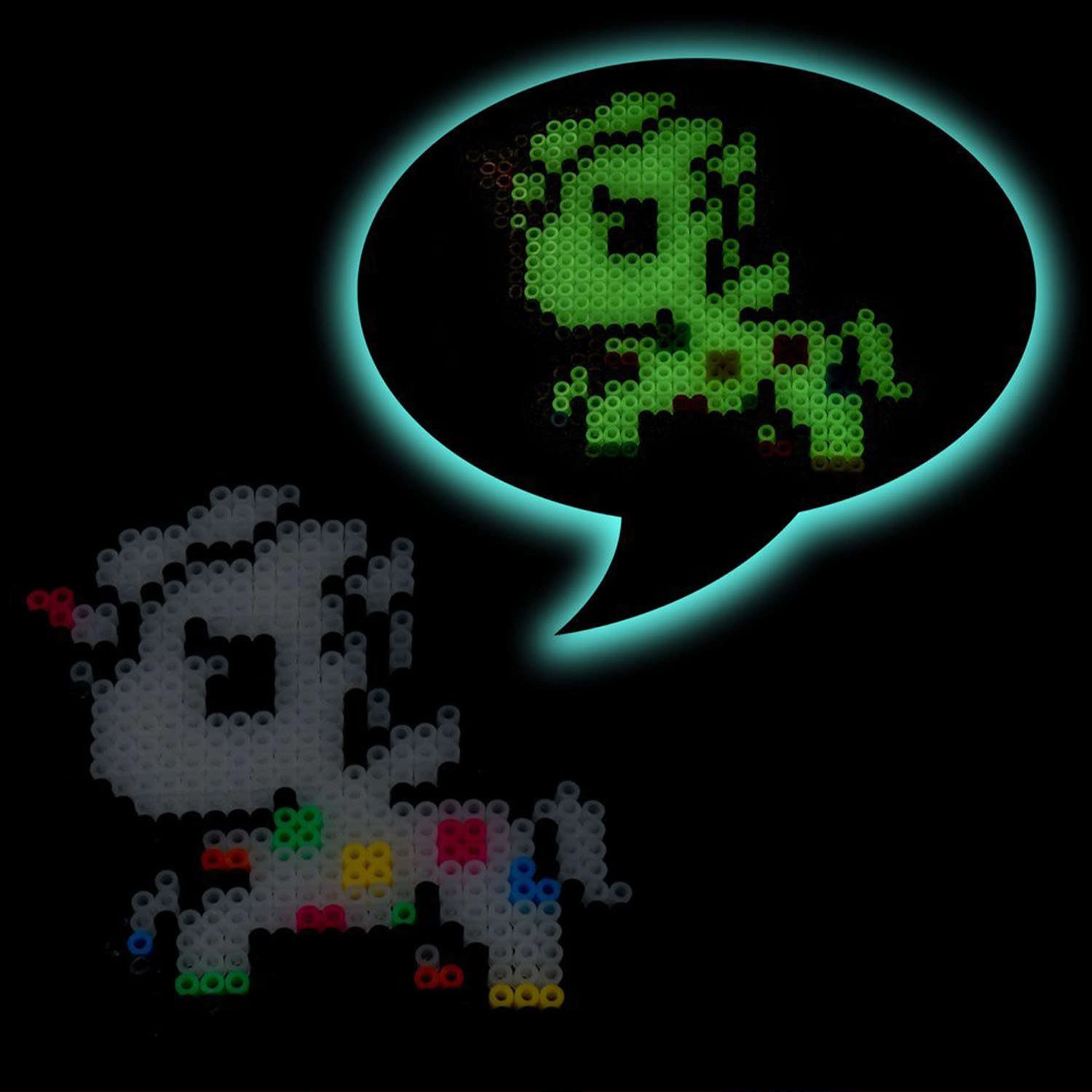 Koraliki fluorescencyjne - Aby koraliki wydzieliły światło należy je przez chwilę naświetlić (np. latarką), w ten sposób wydzielą światło samoistne dające efekt świecącego w ciemności. Aby efekt był widoczny gotowa prasowanka powinna znajdować się w ciemnym pomieszczeniu.
