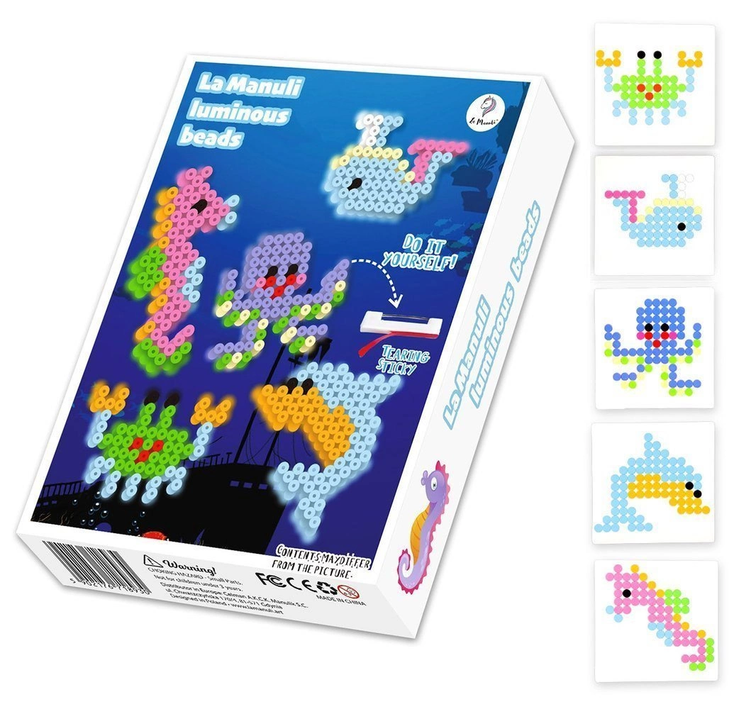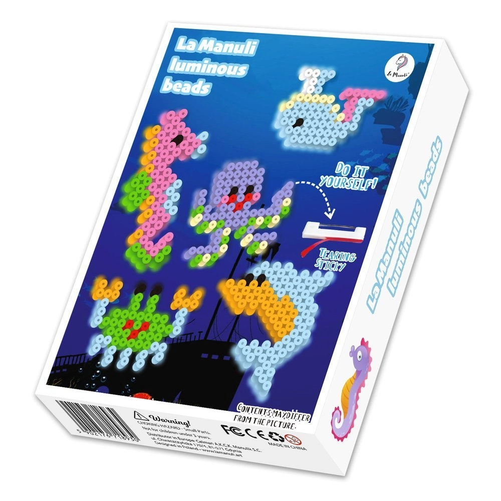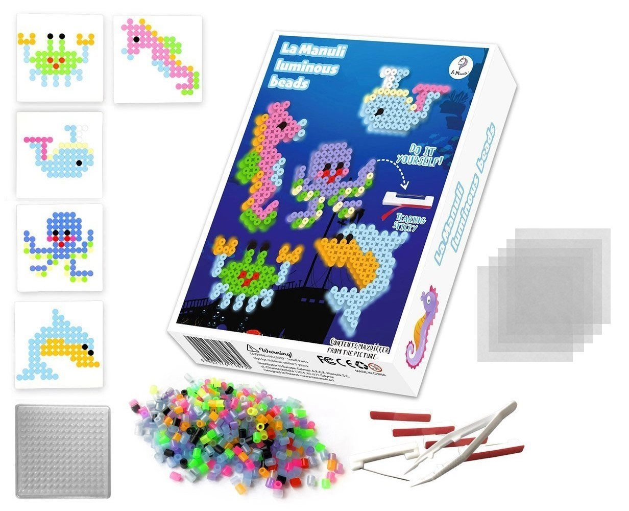 • Zestaw zwierzątek z koralików do prasowania świecących w ciemności. W zestawie aż 5 wzorów zwierzątek morskich do ułożenia oraz akcesoria do stworzenia broszek i zawieszek.