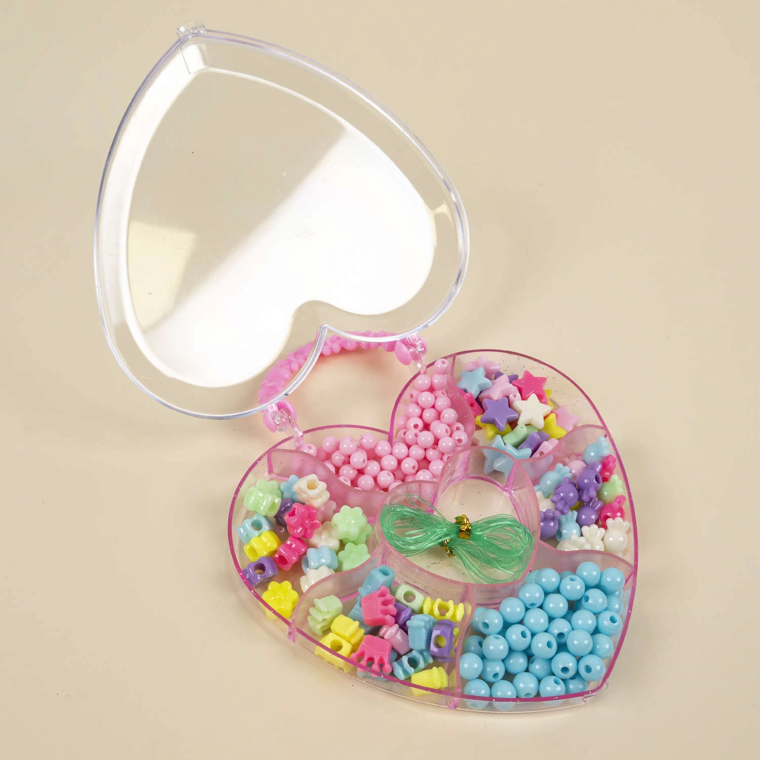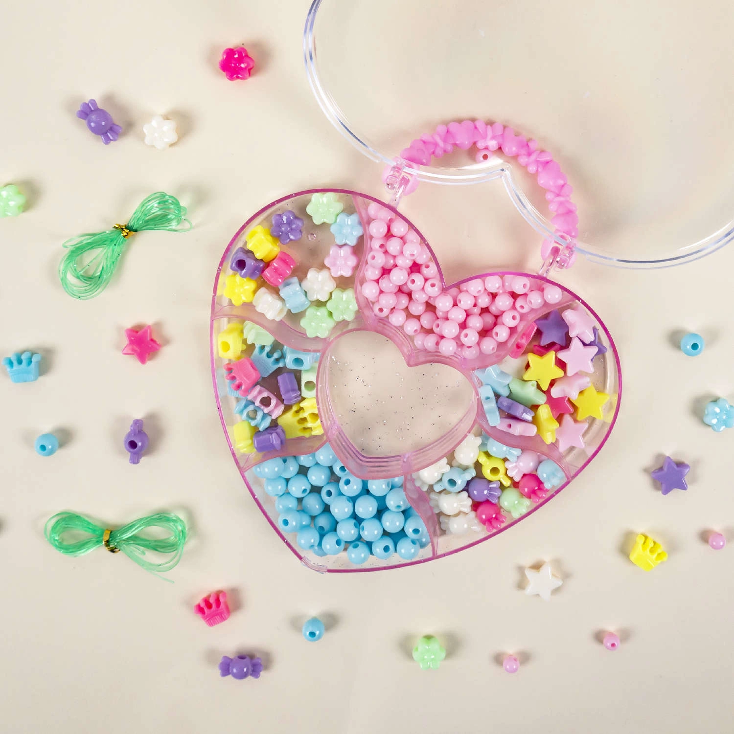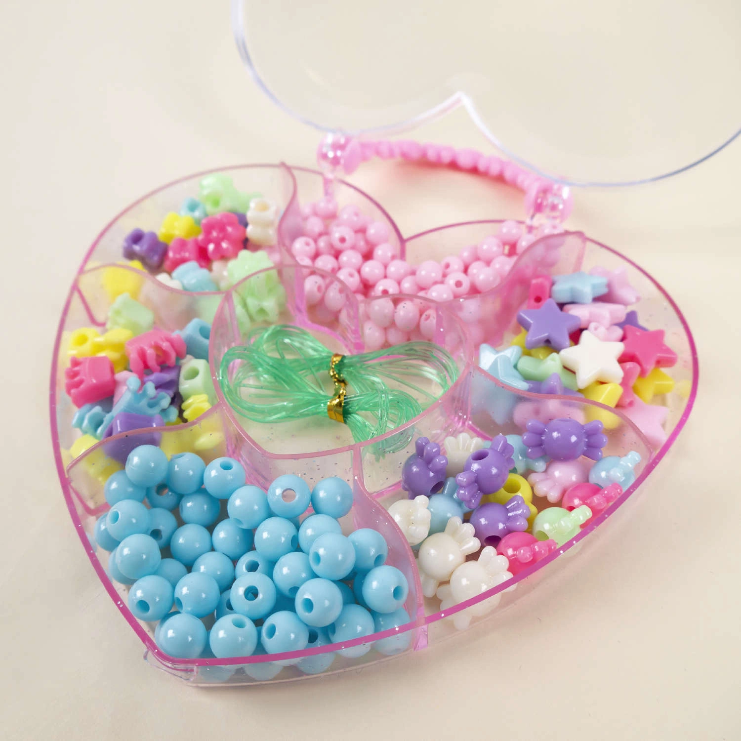 • Kompletny zestaw koralików do biżuterii, bransoletek dla dzieci. W posortowanym, zamykanym na klips pudełku znajdują się przeróżne wielkości oraz kształty koralików razem z żyłką.