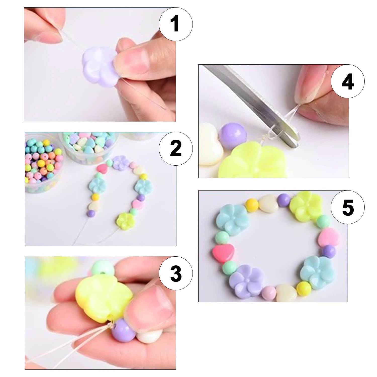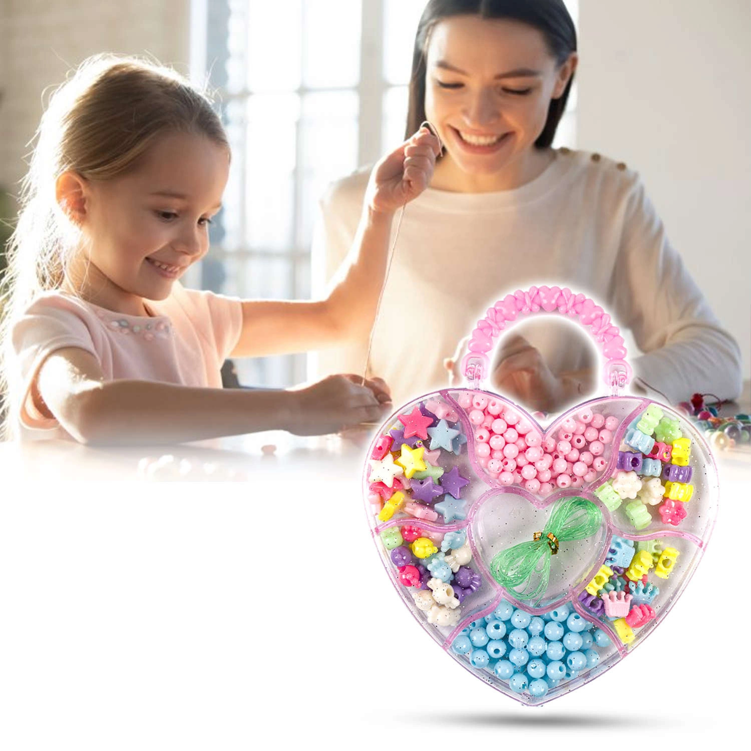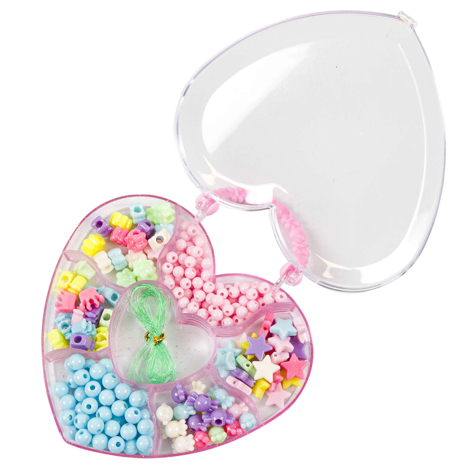 • Kompletny zestaw koralików do biżuterii, bransoletek dla dzieci. W posortowanym, zamykanym na klips pudełku znajdują się przeróżne wielkości oraz kształty koralików razem z żyłką.