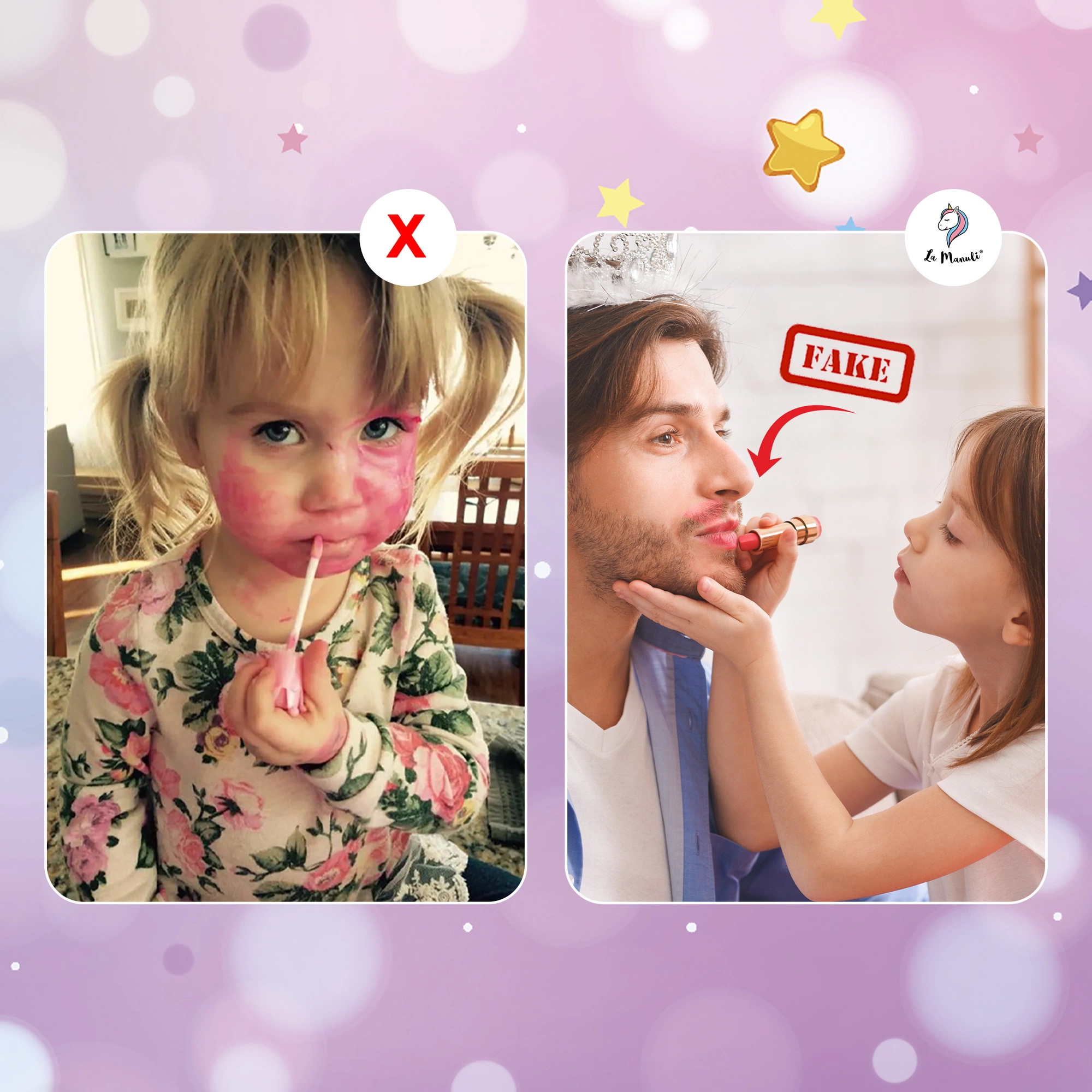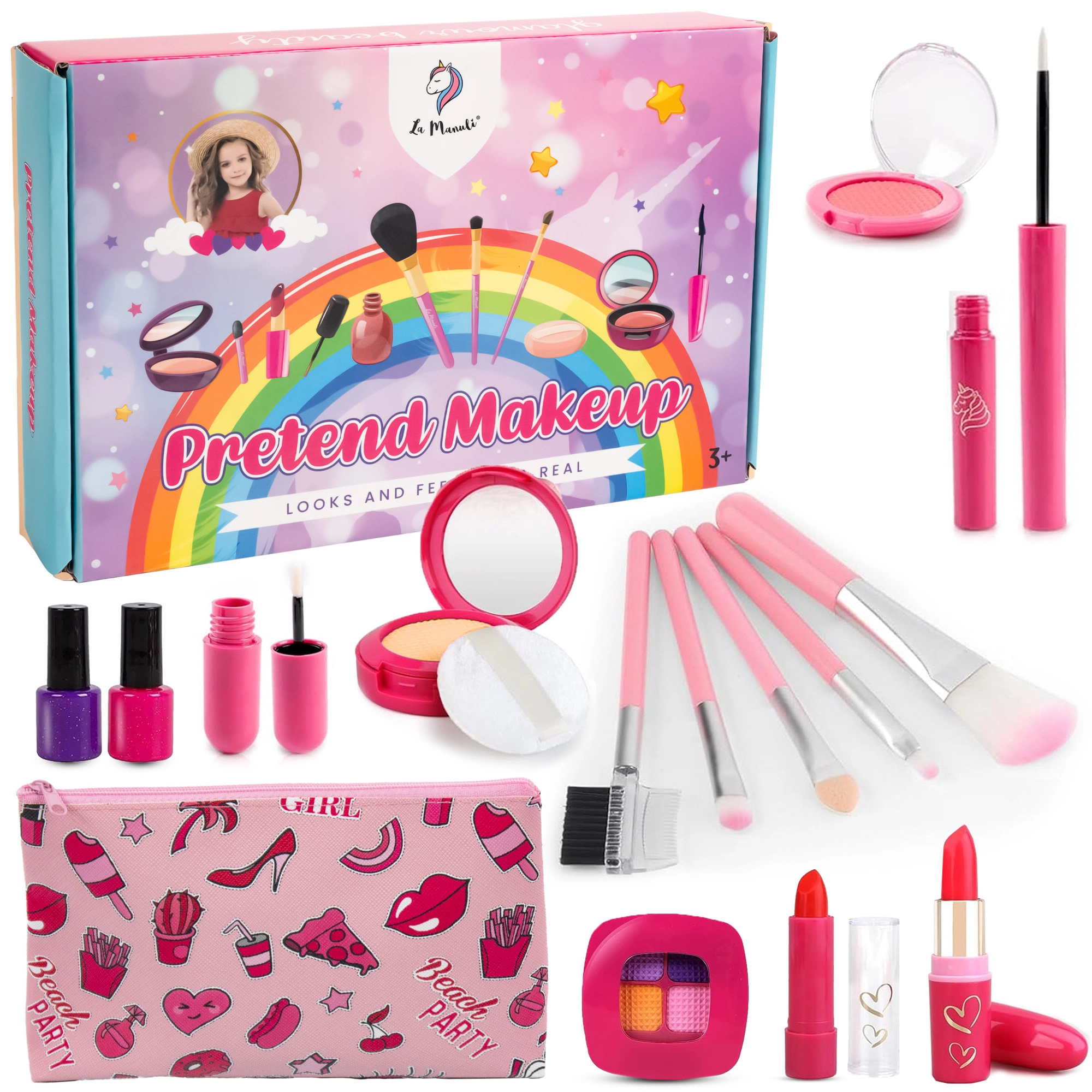 Udawany zestaw kosmetyków od La Manuli do makijażu dla dzieci jest wykonany z bezpiecznych materiałów, plastiku, pianki i gumy. Nie zawiera żadnych płynów i chemikaliów. Jest nietoksyczny i bez smaku. Zestaw do makijażu dla dziewczynek wygląda bardzo realistycznie. Zapewniają, że twoje dzieci są bezpieczniejsze podczas zabawy. Dziewczyny mogą grać w różne gry z doskonałymi zestawami do makijażu, odgrywaniem ról, przebieraniem się w księżniczkę i codziennymi zabawami dla dzieci! W zestawie znajduje się wszystko, czego potrzebuje Twoja mała księżniczka, np. elementy takie jak pędzle do makijażu, paleta cieni do powiek, szminki itp.