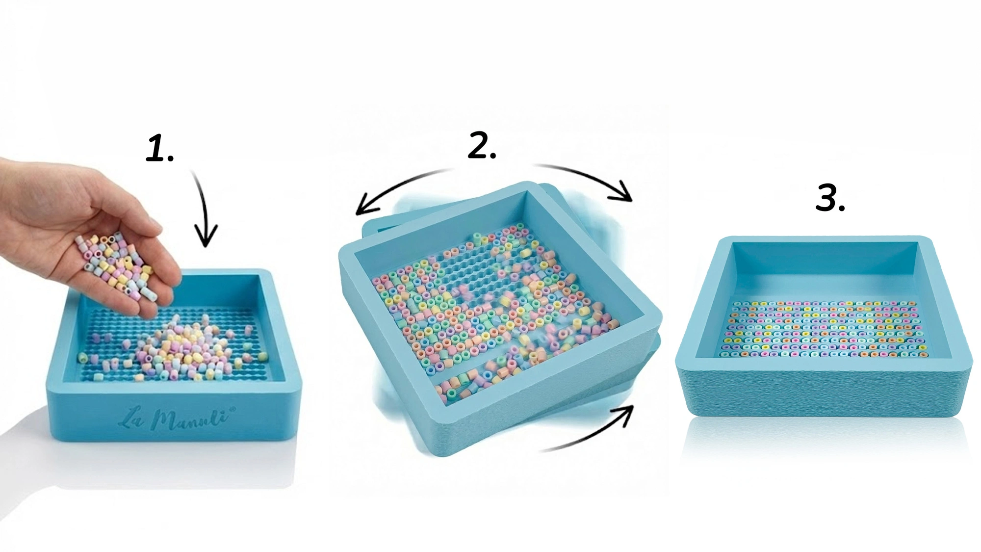 - Delikatnie potrząśnij tacką, aby koraliki ułożyły się w matrycy otworem do góry.