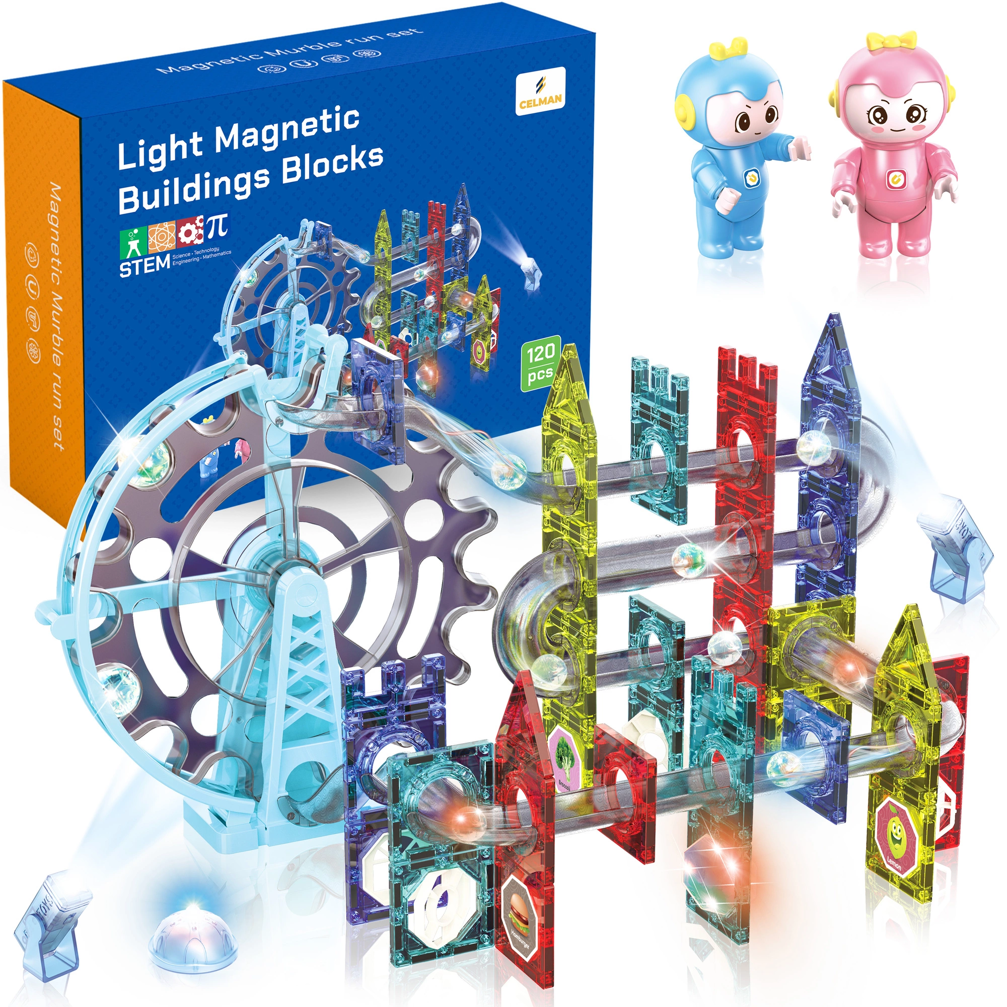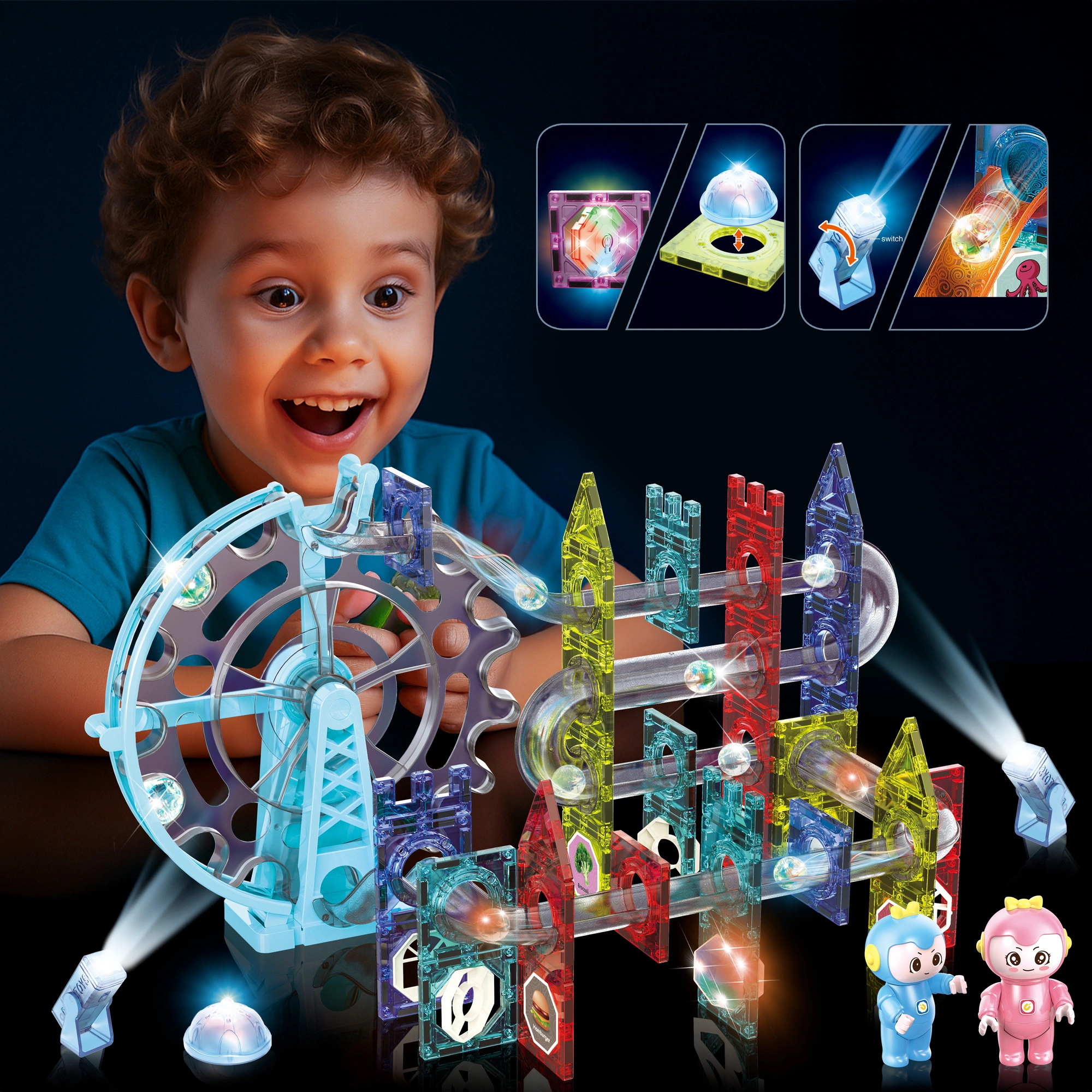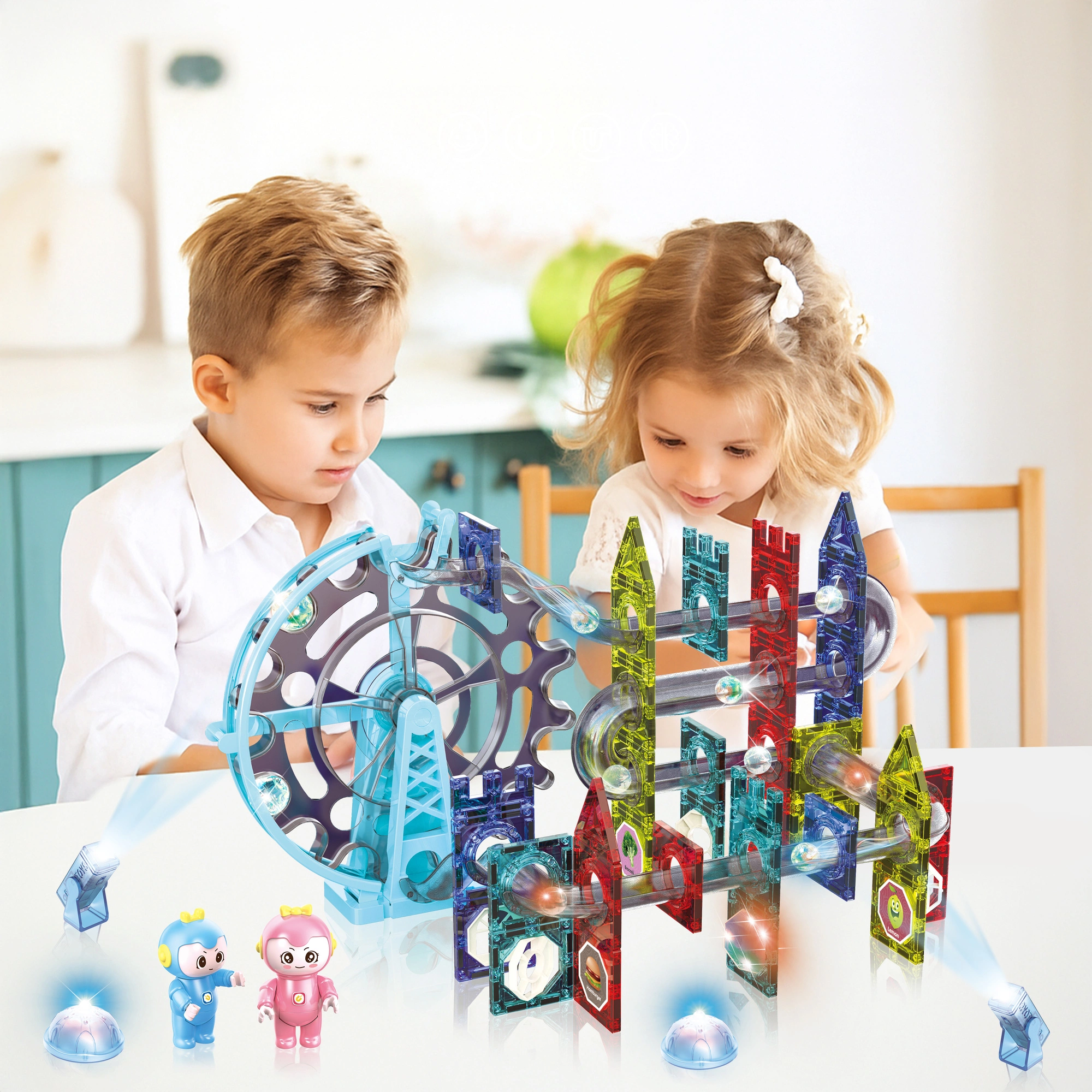 Świecący tor kulkowy kulodrom - Light Magnetic Blocks to edukacyjna zabawka, która jednocześnie zapewnia bezpieczną i kreatywną zabawę. W skład zestawu wchodzi 120 różnorodnych elementów, takich jak klocki z wzorami, naklejki z różnymi motywami, tunele oraz figurki. Klocki są wykonane z wysokiej jakości materiałów.