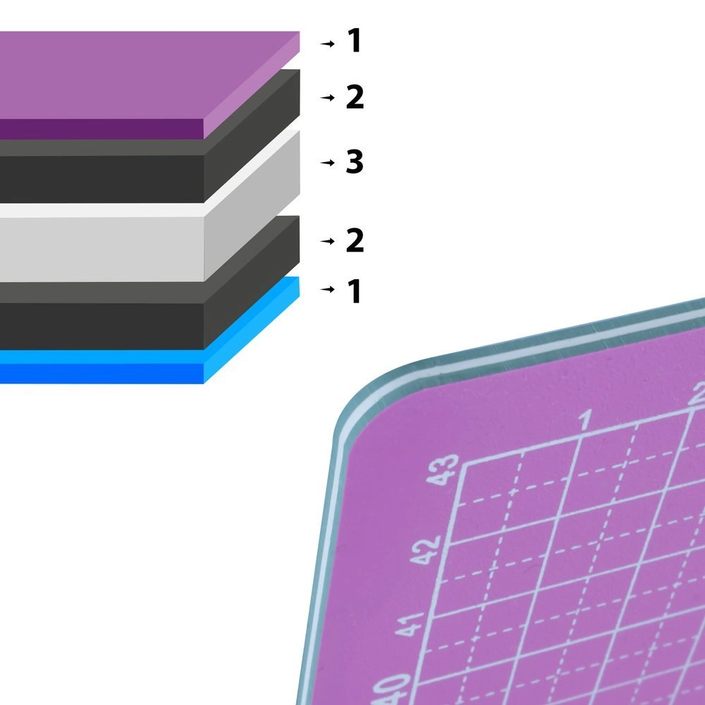 Pięciowarstwowa budowa zapewnia bezpieczeństwo i wygodę pracy. Górne warstwy odpowiadają za samogojenie i stabilność materiałów, natomiast środkowa płyta winylowa o grubości 1 mm zapobiega przebiciu się ostrza na drugą stronę. Całość oferuje wysoką wytrzymałość przy zachowaniu grubości jedynie 3 mm.