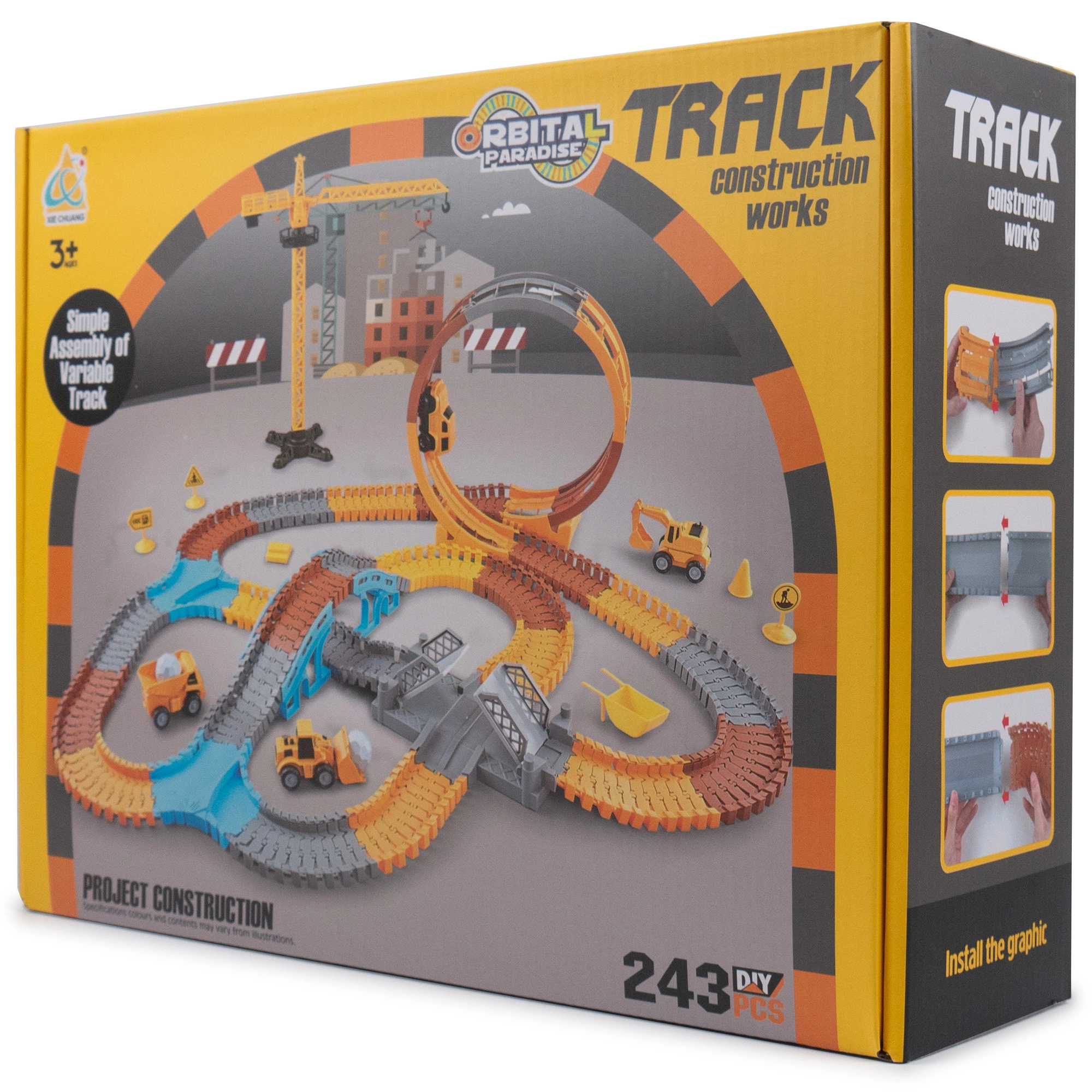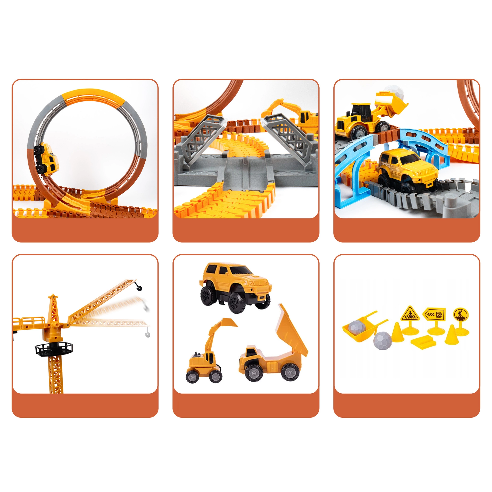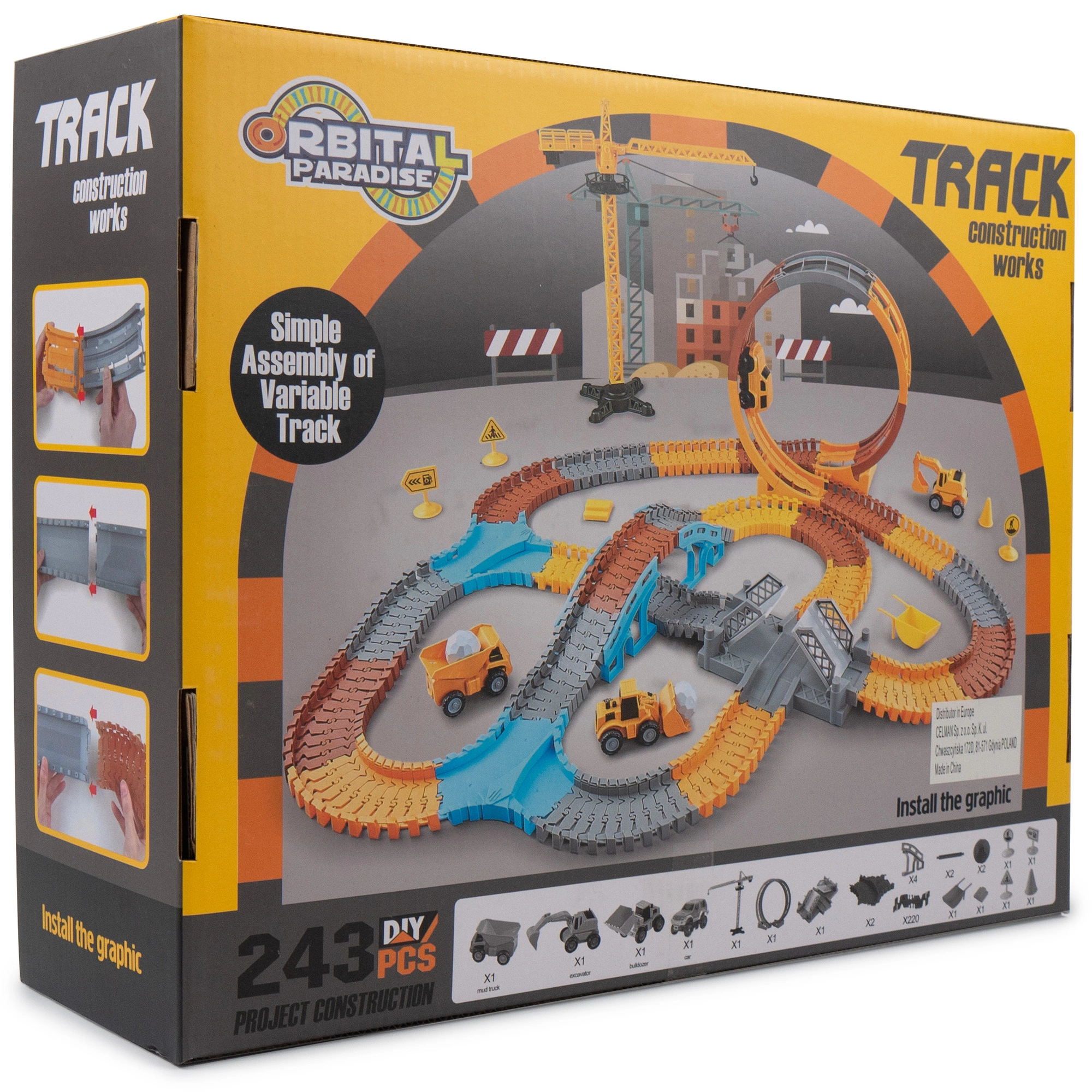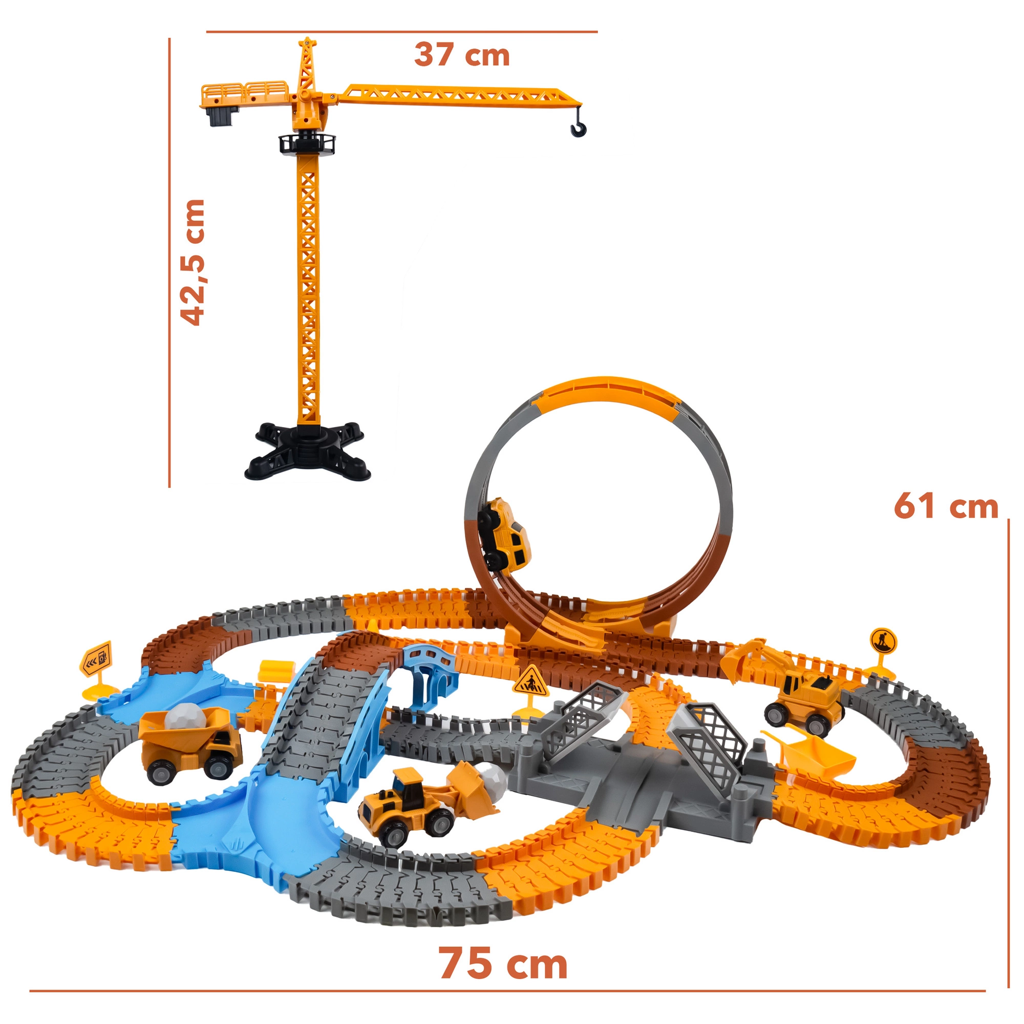- Ten zestaw torów wyścigowych o tematyce budowlanej zawiera 243 części, które zachęcają dzieci do konstruowania własnych przemysłowych światów.
