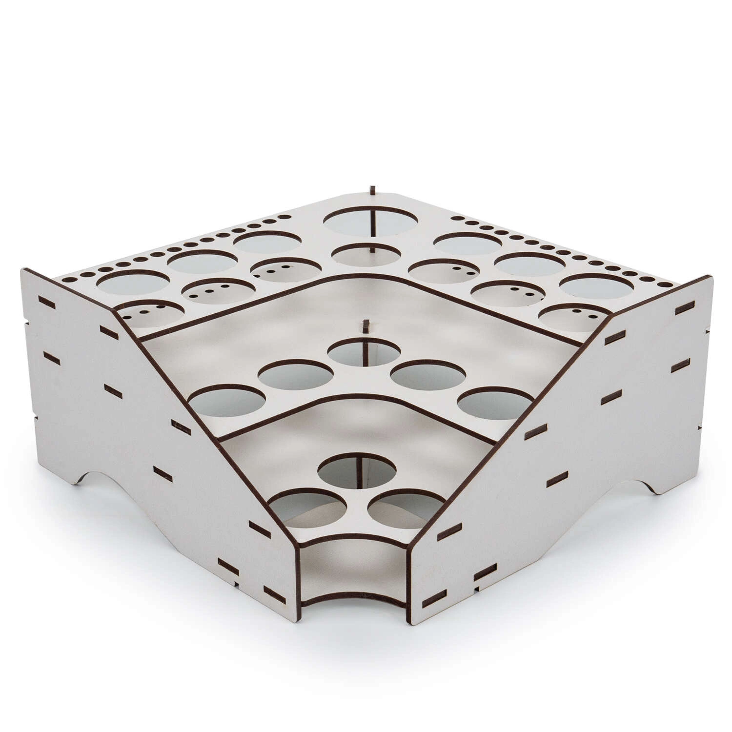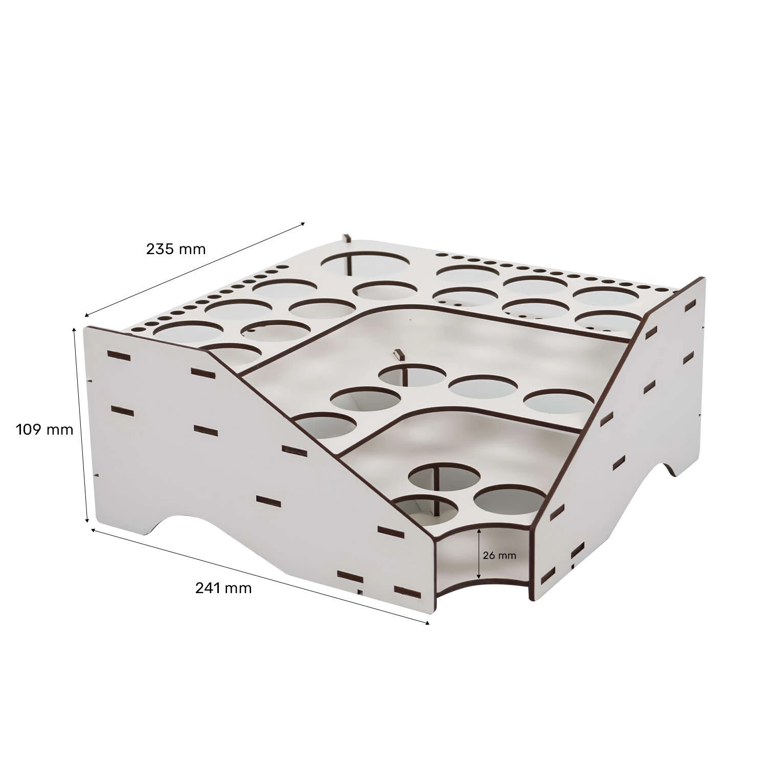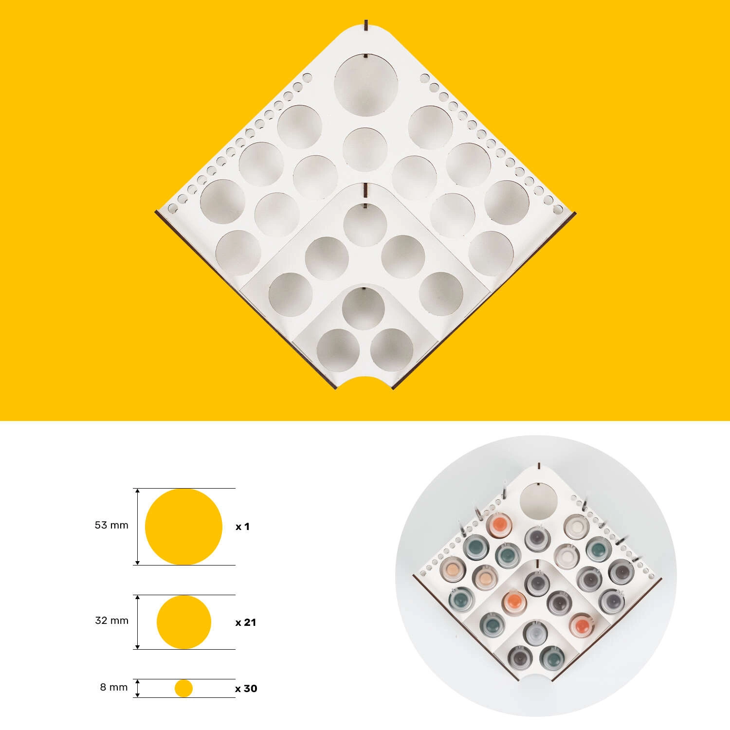 52 precyzyjnie wycięte otwory w trzech rozmiarach (53mm, 32mm, 8mm), pasujące do popularnych marek farb takich jak Citadel, Vallejo, Apple Barrel, FolkArt i Tamiya.