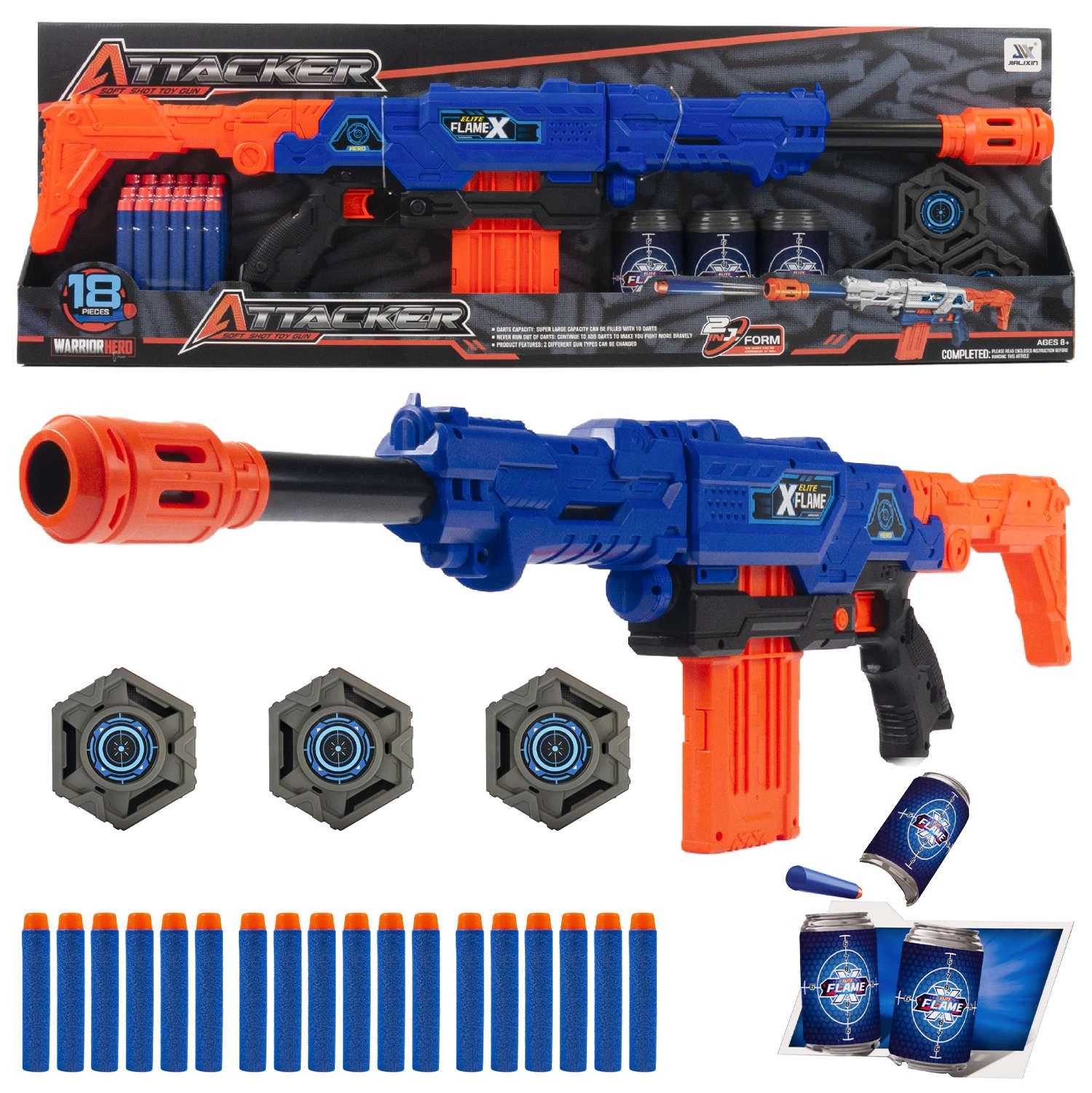 Gotowy na pełną emocji zabawę? Przedstawiamy strzelbę do zabawy ze zmiennym magazynkiem na 18 ultra lekkich i miękkich piankowych strzałek. Gdy skończą Ci się naboje, doładuj amunicje do magazynka, aby szybko kontynuować grę, jest on również kompatybilny z większością zabawkowych pistoletów. Taka zabawa karabinem maszynowym pomaga rozwijać u dzieci koordynację ręka-oko podczas wciągającej rozgrywki.