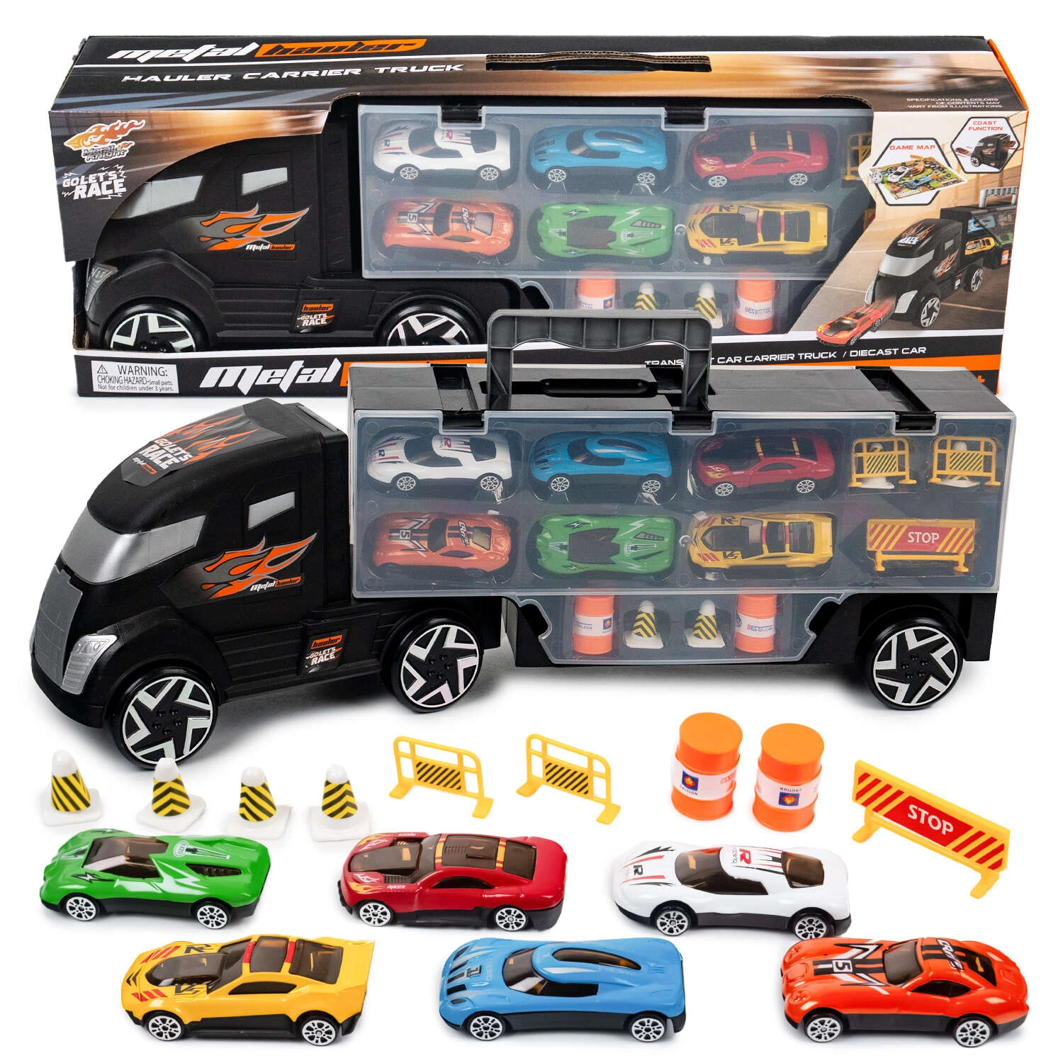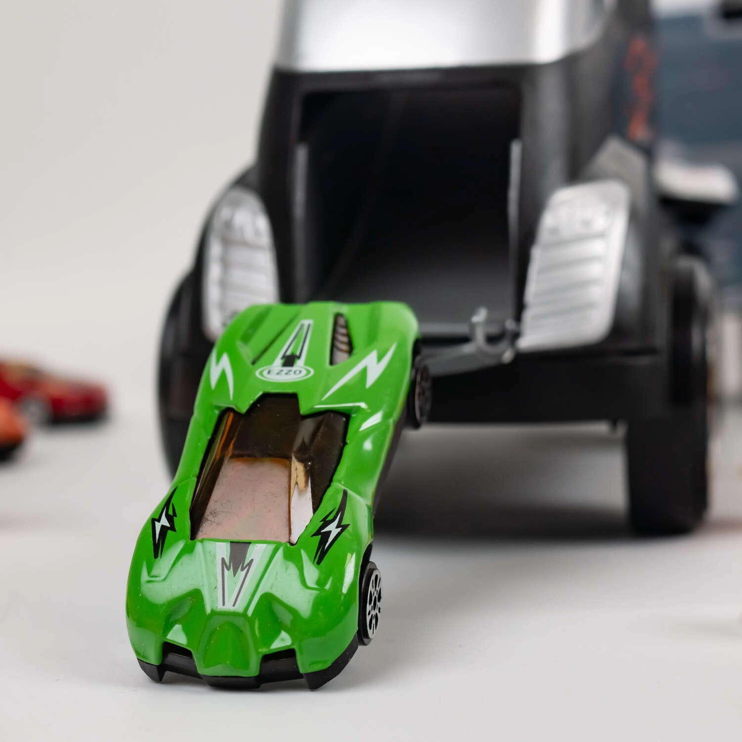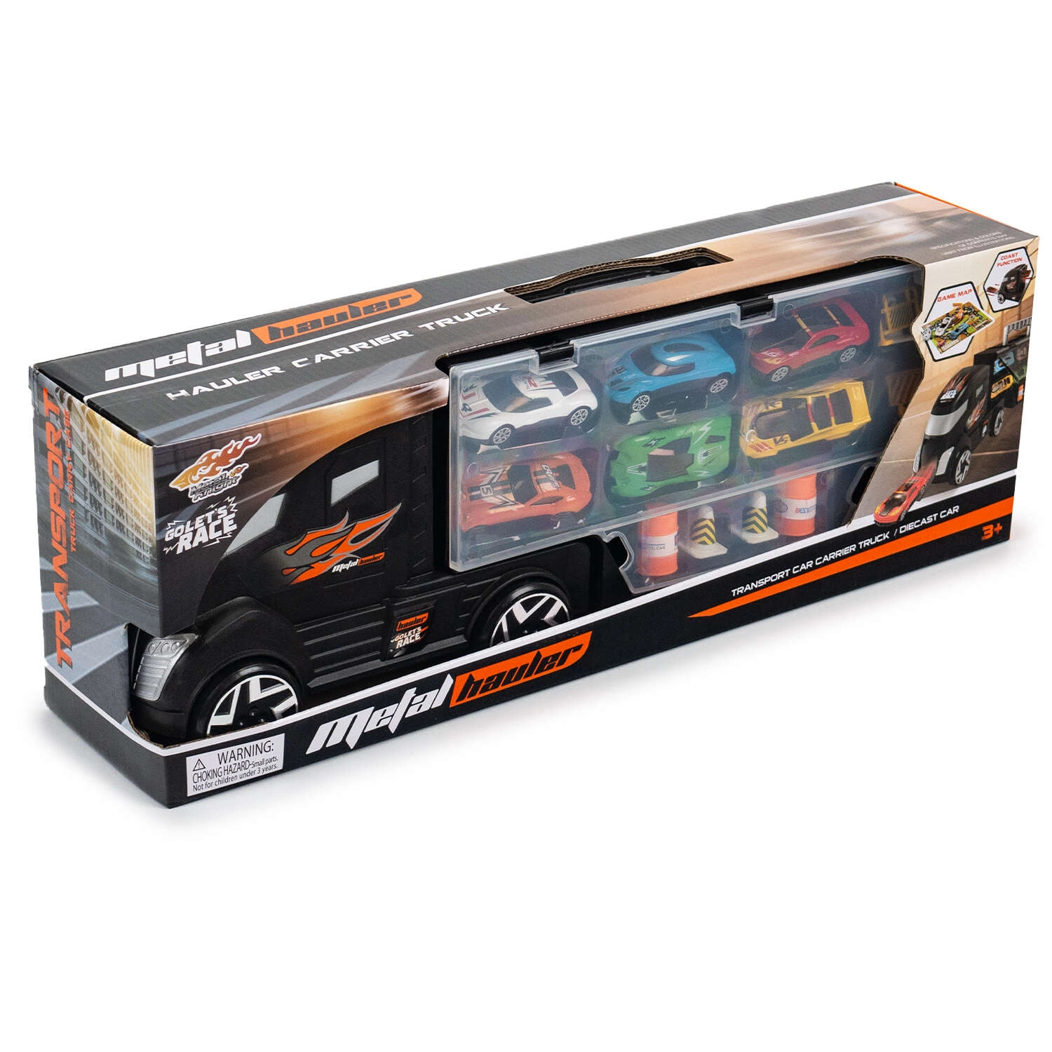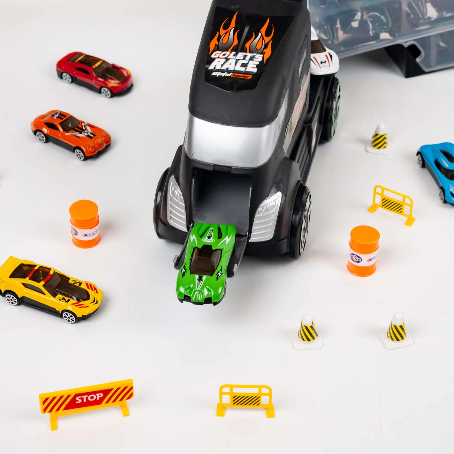 Zestaw składa się z ciężarówki, 6 resoraków i dodatkowych akcesoriów oraz doczepianej lawety w kształcie walizki, którą wygodnie można transportować wraz z zawartością. Dzięki temu zestawowi masz pewność, że Twoja pociecha nie zagubi ani jednego pojazdu ze swojej kolekcji autek. Dzięki wygodnemu uchwytowi przenoszenie całego zestawu jest bezproblemowe.