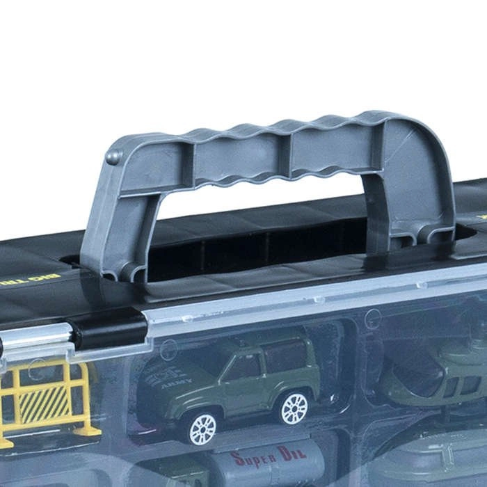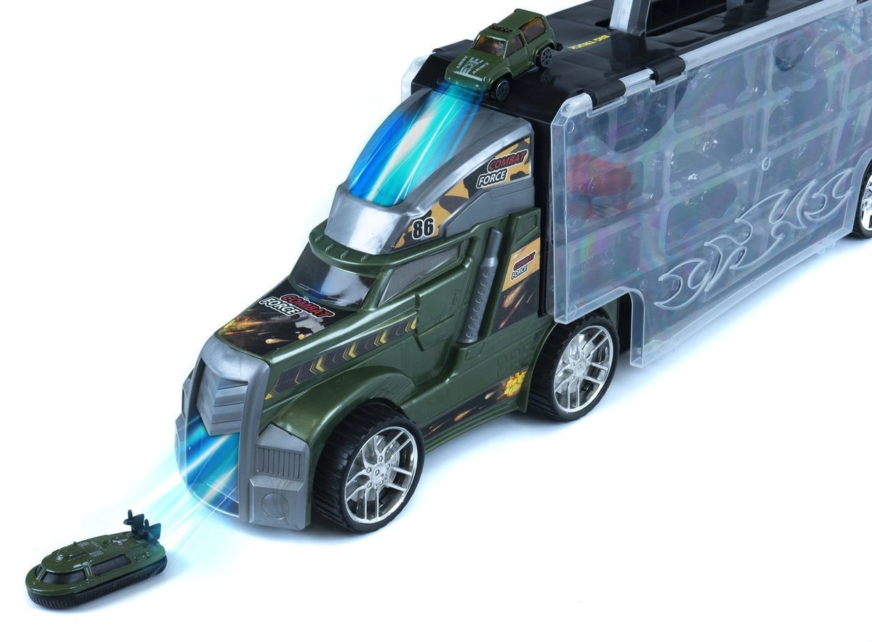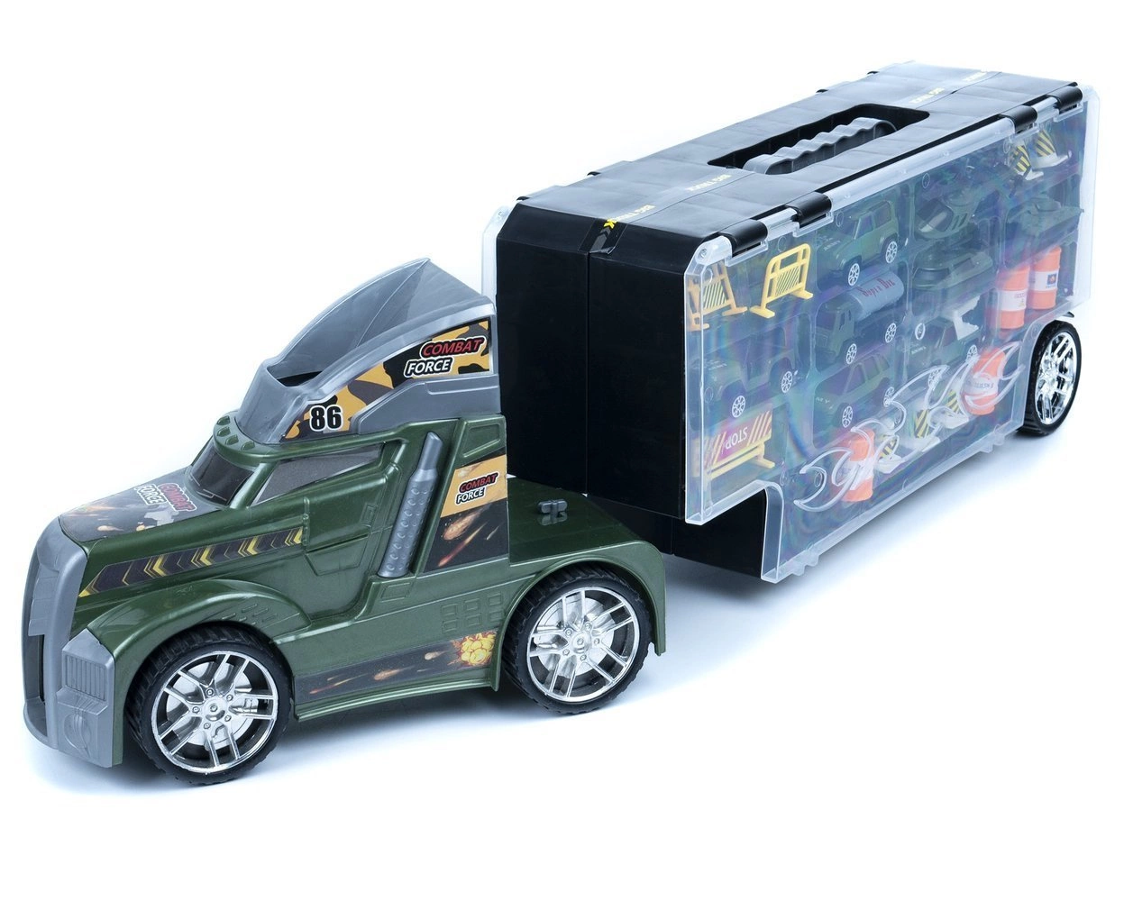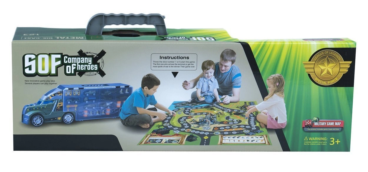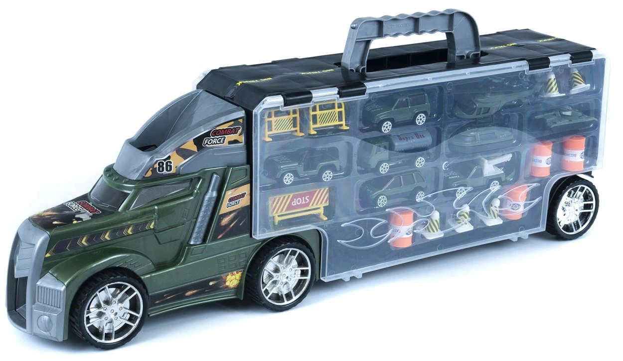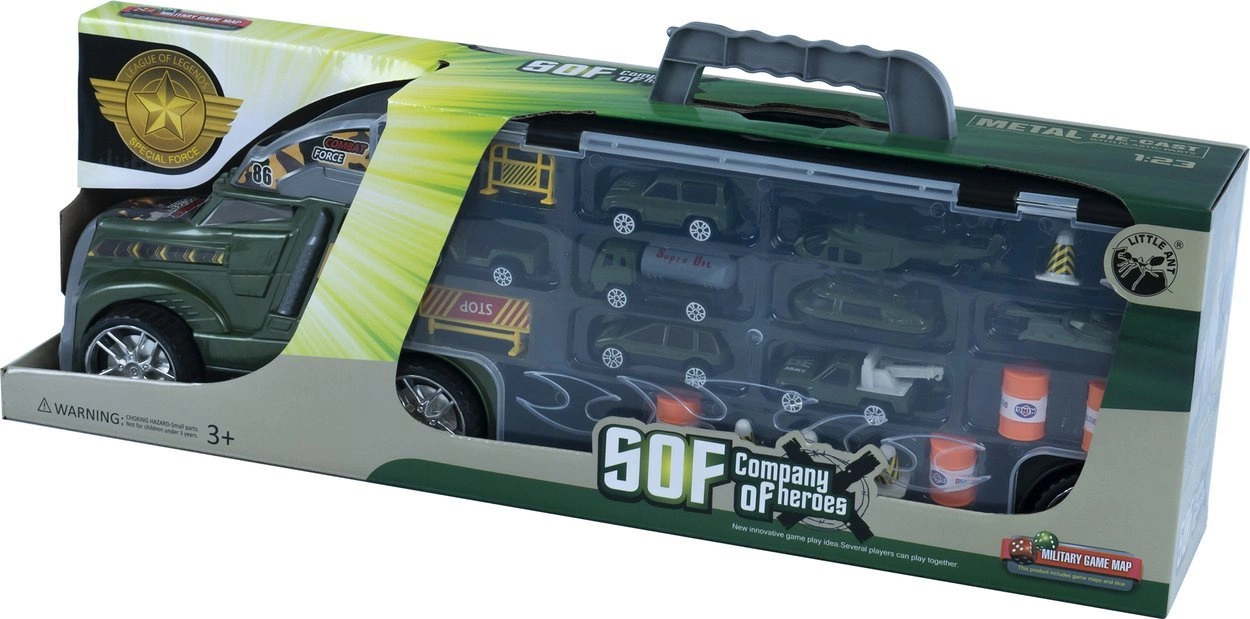 - Zestaw składa się z ciężarówki, 8 resoraków razem z planszą do zabawy i dodatkowych akcesoriów oraz doczepianej lawety w kształcie walizki, którą wygodnie można transportować wraz z zawartością.