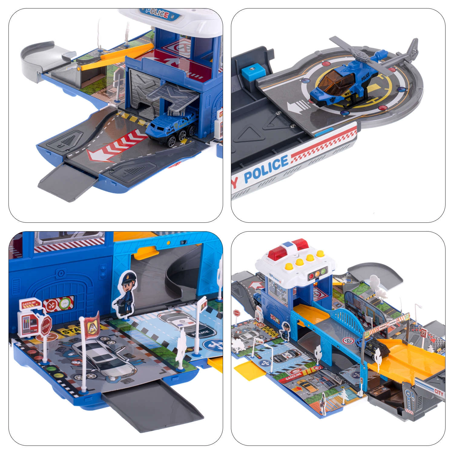 - Unikatowy zestaw dla dzieci - wóz policyjny - remiza, resoraki, helikopter. Doskonała zabawa dla dzieci, zestaw posiada efekty dźwiękowe.